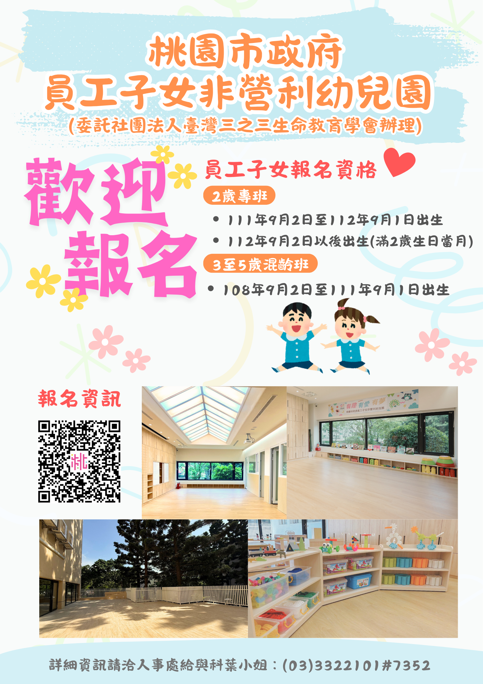 | 四、 | 檢送「桃園市政府員工子女非營利幼兒園(委託社團法人臺灣三之三生命教育學會辦理)員工候補登記入園報名表」及報名DM各1份。 |